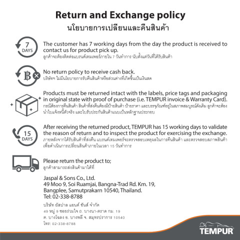 เงื่อนไขการรับประกัน: ครอบคลุมความบกพร่องของวัสดุจากการผลิต/วัสดุ หรือการเปลี่ยนแปลงที่ทำให้เกิดรอยบุ๋มที่มองเห็นได้มากกว่า 2 ซม. บนวัสดุ TEMPUR®