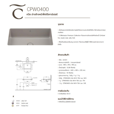 รุ่น: CPW0400 (Quil Under Counter Lav.)