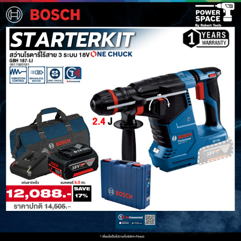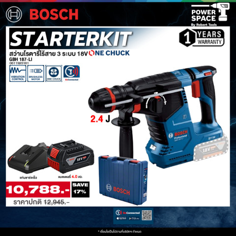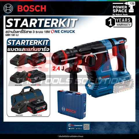 BOSCH GBH 187-LI สว่านโรตารี่ไร้สายระบบ One-Chuck 3 ระบบ ที่ให้ความคล่องตัวแบบไร้สาย ตอบโจทย์งานเจาะและงานติดตั้งได้รอบด้าน มาพร้อม แบตเตอรี่ 18V ชุดแบต 5Ah และ แท่นชาร์จ พร้อมใช้งานทันที เหมาะสำหรับช่างมืออาชีพและผู้ใช้งานที่ต้องการพลัง แรง และความปลอดภัยในการทำงานในเครื่องเดียว