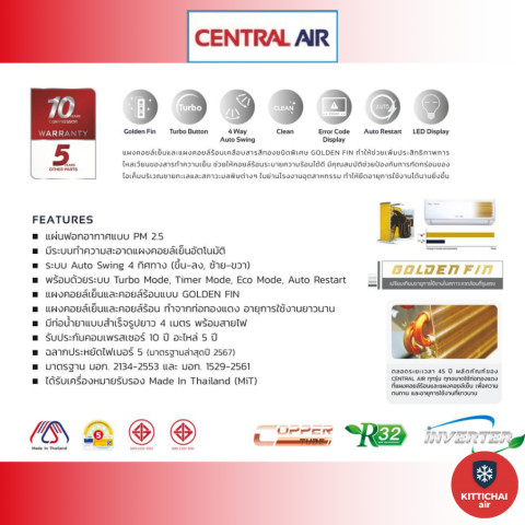 ติดตั้งฟรีทั่วไทย แอร์ CENTRAL AIR INVERTER คอยทองแดง รับประกันศูนย์ คอมเพลสเซอร์ 10 ปี ราคา 25,201.00 บาท