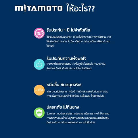 อัปเกรดช่วงล่างให้ “หนึบ แน่น มั่นใจ” ด้วยโช๊คอัพ MIYAMOTO แบรนด์ไทยมาตรฐานคุณภาพสไตล์ญี่ปุ่น ออกแบบมาเพื่อรถที่ต้องการความเร็ว การเกาะถนนที่ดี และสายลุย Off-road รวมถึงรถ ยกสูง โดยเฉพาะ ด้วยแกนโช๊คขนาดใหญ่ช่วยให้กระบอกและลูกสูบทำงานได้เต็มประสิทธิภาพ จูนการรับน้ำหนักได้ดีขึ้น ลดอาการย้วย เพิ่มความนิ่งทุกจังหวะขับขี่ พร้อมการันตีจากผู้ใช้งานจริงมากกว่า 10,000 คัน