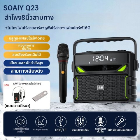 ลำโพงบลูทูธพกพาสำหรับร้องคาราโอเกะกลางแจ้ง (SOAIY Q23) ในราคา 5,488.63 บาท เติมสีสันให้ทุกช่วงเวลาด้วยเสียงที่ดังชัด พกพาง่าย และพร้อมลุยกิจกรรมได้หลากหลาย ไม่ว่าจะเป็นปาร์ตี้นอกบ้าน ปิกนิก ร้องคาราโอเกะกับเพื่อน ๆ หรือใช้เปิดเพลง/ประกาศเสียงสำหรับธุรกิจขนาดเล็ก ก็เอาอยู่ในเครื่องเดียว