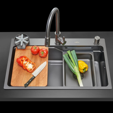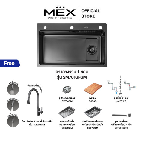 MEX รุ่น SM761GFGM อ่างล้างจานมัลติฟังก์ชัน 1 หลุมขนาดใหญ่ ดีไซน์สวยทันสมัย โทน Grey Metal ช่วยยกระดับครัวให้ดูพรีเมียม พร้อมอุปกรณ์เสริมครบชุดสำหรับ “ล้าง–เตรียม–จัดการวัตถุดิบ” ได้บนอ่างในจุดเดียว สะดวกและประหยัดพื้นที่ เหมาะกับครัวยุคใหม่ที่ใช้งานครบหลายหน้าที่ในเวลาเดียวกัน
