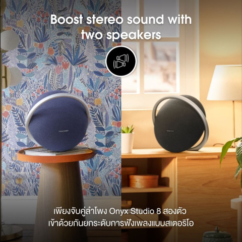 จับคู่ Onyx Studio 8 สองตัวแบบไร้สาย เพื่อสร้างมิติเสียงสเตอริโอที่กว้างขึ้น ดื่มด่ำยิ่งขึ้นไมโครโฟนคู่ รับสายคมชัด