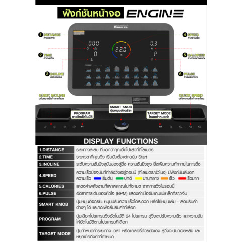 หน้าจอแสดงผล 6 ฟังก์ชัน: เวลา / ความเร็ว / ความชัน / แคลอรี่ / ระยะทาง / ชีพจรหัวใจ