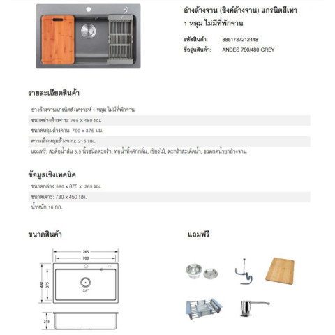 ขนาดอ่างล้างจาน: 765 x 480 มม.
