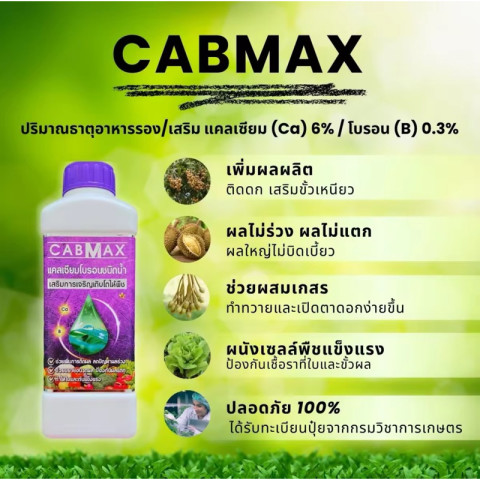 CABMAX (แคลเซียม-โบรอน): ใช้ฉีดพ่นเพื่อกระตุ้นตาดอก ช่วยให้ ผลดก ขั้วเหนียว แข็งแรง ลดปัญหา ผลเน่า ผลร่วง เพิ่มคุณภาพผลผลิต