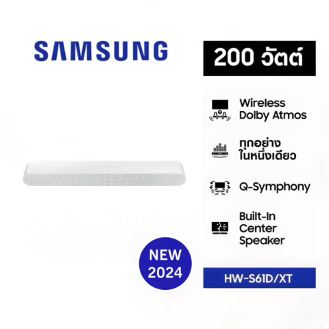 SAMSUNG Soundbar รุ่น HW-S61D/XT สีขาว WHITE (NEW 2024) ซาวด์บาร์ดีไซน์ออลอินวันที่ยกระดับเสียงจากทีวีของคุณให้ทรงพลังและสมจริงรอบทิศทางในเครื่องเดียว ด้วยระบบเสียง 5.0 แชนแนล ผสานวูฟเฟอร์ 4 ตัว และทวีตเตอร์ 3 ตัวในบอดี้ขนาดกะทัดรัด แต่ให้มิติเสียงเต็มห้อง พร้อมรองรับระบบเสียง 3 มิติรอบทิศทาง Dolby Atmos และ DTS Virtual:X แบบไร้สาย ให้คุณดื่มด่ำกับเสียงสมจริงที่ไหลเวียนทั้งด้านบนและรอบตัวราวกับอยู่ในโรงภาพยนตร์