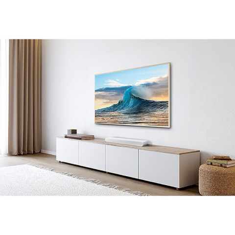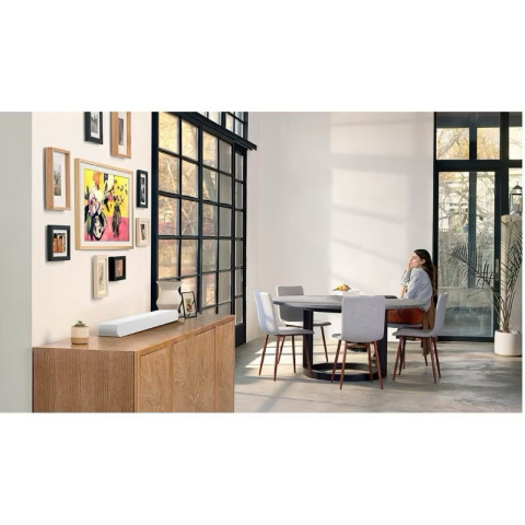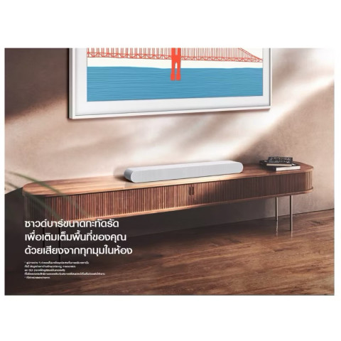ตัวเครื่องสีขาวดูทันสมัย ช่วยเพิ่มความหรูหราให้มุมบันเทิงภายในบ้าน เหมาะสำหรับผู้ที่ต้องการซาวด์บาร์ตัวเดียวจบ ให้ทั้งความคมชัดของเสียงและมิติรอบทิศทางโดยไม่ต้องพึ่งลำโพงหลายตัว