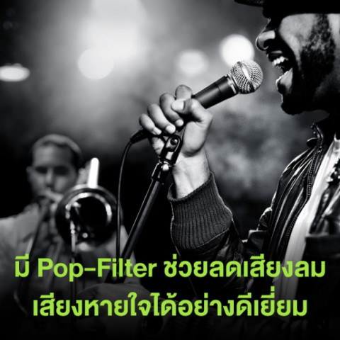 มีตัวกรองลมภายใน (Pop Filter) ช่วยลดเสียงลมและเสียงพ่นลมให้นุ่มนวลขึ้น