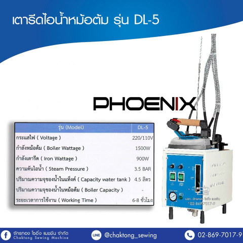 PHOENIX เตารีดไอน้ำหม้อต้ม รุ่น DL-5 เตารีดไอน้ำสำหรับงานรีดระดับมืออาชีพ เหมาะกับการใช้งานหนักต่อเนื่องใน โรงงานขนาดเล็ก ร้านตัดเย็บ ร้านซักรีด ให้ไอน้ำสม่ำเสมอ ช่วยให้ผ้าเรียบไว ประหยัดเวลา และถนอมเนื้อผ้าในทุกประเภทงานรีด