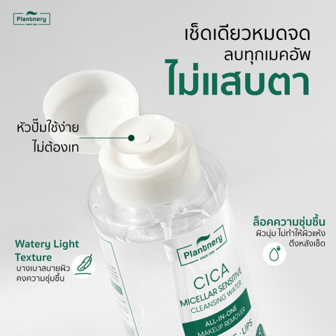 Plantnery CICA Micellar Sensitive Cleansing Water 500ml คลีนซิ่งไมเซล่าสูตรอ่อนโยนเพื่อผิวแพ้ง่ายและผิวเป็นสิว เช็ดเมคอัพและสิ่งสกปรกออกอย่างหมดจดในขั้นตอนเดียว พร้อมเติมความชุ่มชื้นให้ผิวนุ่มสบาย ไม่แห้งตึง ด้วยเนื้อสัมผัสแบบ Watery Light Texture บางเบาเหมือนน้ำบริสุทธิ์ เช็ดง่าย ไม่ทิ้งคราบเหนอะหนะหรือฟิล์มกวนใจ เหมาะสำหรับใช้ทุกวันทั้งเช้า-เย็น
