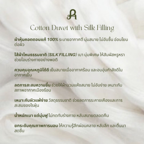 ไส้ด้านใน (Filling) ทำจากใยไหม Mulberry Silk สายพันธุ์ที่ได้รับการยอมรับว่าเป็นเส้นใยไหมที่ดีที่สุดในโลก เนื้อไหมเนียนละเอียด ไม่ผสมเส้นใยสังเคราะห์ จึงให้ความรู้สึกโปร่ง เบา คลุมแล้วไม่หนักตัว แต่ยังคงความอบอุ่นกำลังดีตลอดคืน ส่วนผ้าหุ้มด้านนอก (Shell) ทอจากเส้นใยคอตตอน 100% ความละเอียด 300 เส้นด้ายต่อตารางนิ้ว ผิวผ้านุ่ม ละมุน ไม่ระคายผิว และดูแลรักษาง่าย ซักทำความสะอาดได้โดยไม่ยุ่งยาก