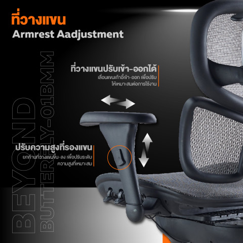 ปรับที่วางแขนเข้า–ออก (Arm-pad inward/outward adjustment) – รองรับการพิมพ์งาน เล่นเกม หรือใช้งานเมาส์ในท่าทางที่ถนัด