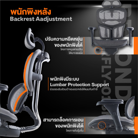 ระบบ Lumbar Protection Support ช่วยรองรับส่วนเว้าเอว/หลัง ให้แผ่นหลังแนบกับเก้าอี้ ช่วยจัดท่าทางการนั่งให้ถูกต้อง