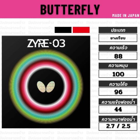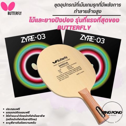ชุดนี้เป็นการผสานกันระหว่างไม้คาร์บอนที่ขึ้นชื่อว่าเร็วและแข็งที่สุดรุ่นหนึ่งของ Butterfly อย่าง Sardius กับยางปิงปองรุ่นใหม่ที่เน้นสปินจัดจ้านและพลังระเบิดสูงอย่าง Zyre 03 สร้างสไตล์การเล่นเกมรุกที่ดุดัน ปิดแต้มได้อย่างเฉียบขาดตั้งแต่ลูกเปิดเกมจนถึงลูกสวนโต้จากระยะกลางและระยะไกล