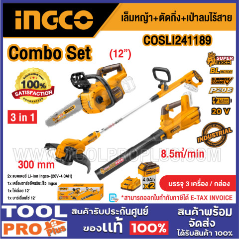 เปลี่ยนงานดูแลสวนให้เป็นเรื่องง่ายและสนุกขึ้นด้วย INGCO Combo Set เล็มหญ้า+ตัดกิ่ง+เป่าลมไร้สาย รุ่น COSLI241189 เซ็ตเดียวครบทั้งเลื่อยโซ่ไร้สาย, เครื่องตัดหญ้าไร้สาย และเครื่องเป่าใบไม้ไร้สาย มาพร้อมแบตเตอรี่และที่ชาร์จ พร้อมใช้งานทันที เหมาะทั้งเจ้าของบ้าน, ช่างสวน และงานดูแลพื้นที่สีเขียวทุกขนาด