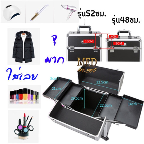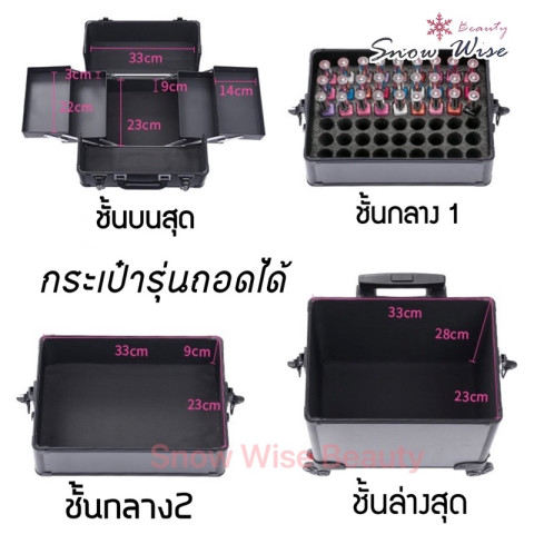 3 ชั้น: ชั้นล่างลึก ชั้นกลางสำหรับพวกขวดโลชั่น/เอสเซนส์ ชั้นบนถอดเป็นกระเป๋าหิ้วได้