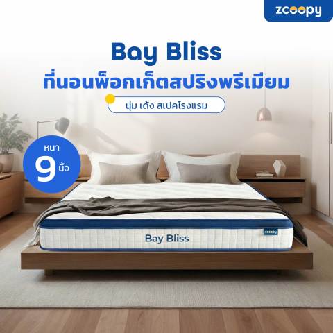 Zcoopy ที่นอนพ็อกเก็ตสปริงมาตรฐานโรงแรม ผสานความเย็น รุ่น Bay Bliss หนา 9 นิ้ว มอบสัมผัสการนอนแบบโรงแรมทุกคืน ด้วยโครงสร้างพ็อกเก็ตสปริงที่รองรับสรีระอย่างเป็นจุดๆ ลดแรงสั่นสะเทือนจากการขยับตัว ผสานชั้นวัสดุให้ความเย็น ช่วยระบายความร้อนและความอับชื้นได้ดี ตื่นมาพร้อมความสดชื่น นุ่มกำลังดีแต่ยังแน่นรองรับได้มั่นคง เหมาะทั้งคนที่นอนหงาย นอนตะแคง และคู่รักที่อยากนอนหลับต่อเนื่องไม่ถูกรบกวน