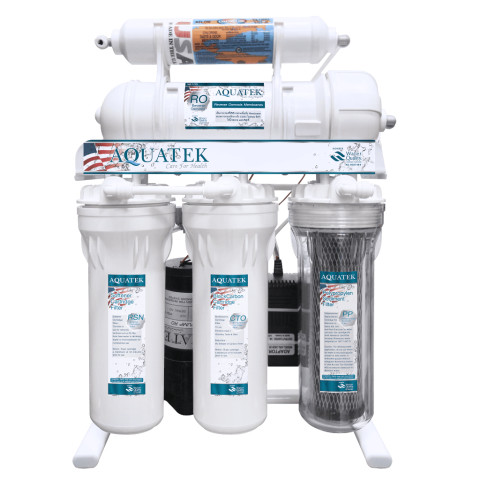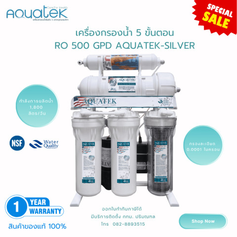 เครื่องกรองน้ำ 5 ขั้นตอน AQUATEK รุ่น SILVER RO 500 GPD (2007014) คือคำตอบสำหรับบ้านและธุรกิจที่ต้องการน้ำดื่มสะอาด รสชาติดี และมั่นใจทุกแก้ว ด้วยระบบกรอง RO 5 ขั้นตอนที่คัดสรรไส้กรองมาตรฐาน Food Grade ขนาด 10 นิ้ว นำเข้าจากสหรัฐอเมริกา โครงสร้างแข็งแรง ทันสมัย พร้อมขาตั้ง ติดตั้งง่าย ไม่ต้องเจาะผนัง เหมาะสำหรับใช้งานภายในบ้าน ร้านอาหาร คาเฟ่ หรือสำนักงาน