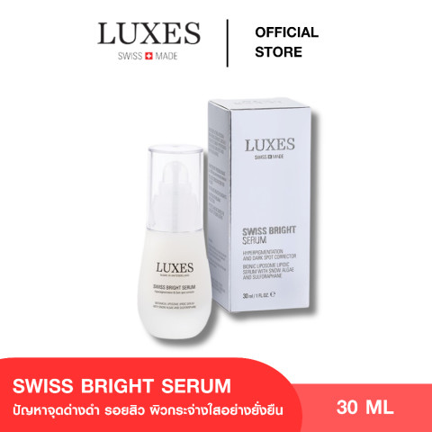 LUXES SWISS BRIGHT SERUM 30ml. เซรั่มบำรุงผิวสูตรเข้มข้นแต่เนื้อบางเบา ซึมไว ช่วยเพิ่มความกระจ่างใสอย่างเป็นธรรมชาติ ปรับสีผิวให้ดูสม่ำเสมอ ลดเลือนรอยดำรอยแดงจากสิว รวมถึงปัญหาฝ้า กระ และจุดด่างดำ ให้ผิวดูเรียบเนียน สุขภาพดี พร้อมเผยผิวโกลว์ใสในทุกวัน