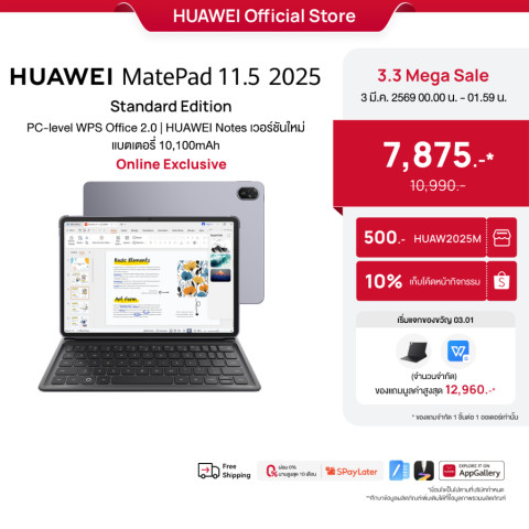 [NEW] HUAWEI MatePad 11.5 2025 Standard Edition แท็บเล็ตจอใหญ่ที่ออกแบบมาเพื่อการทำงานและการเรียนแบบจริงจัง มาพร้อม PC-level WPS Office 2.0 ให้ประสบการณ์เอกสารใกล้เคียงคอมพิวเตอร์ ใช้งานคล่องทั้งพิมพ์งาน จัดทำสไลด์ และแก้ไขไฟล์ได้ทุกที่ทุกเวลา เหมาะสำหรับนักเรียน นักศึกษา และสายทำงานที่ต้องการอุปกรณ์พกพาแต่ “ทำงานได้จริง”