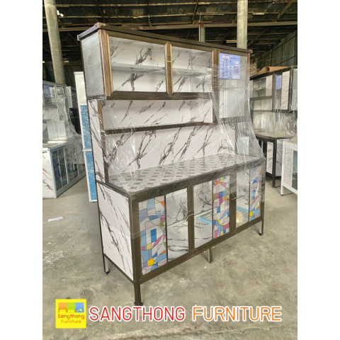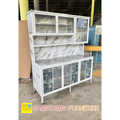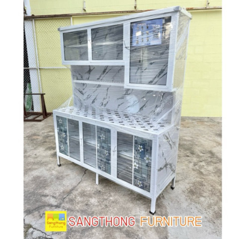 ขนาดตู้ครัว: กว้าง 150 ซม. x ลึก 52 ซม. x สูง 180 ซม. รองรับการจัดวางเตาแก๊ส หม้อ กระทะ และอุปกรณ์ครัวได้ครบ