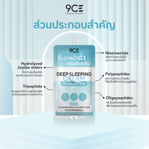 ค้นพบผิวสวยใสในข้ามคืนกับ 9CE Deep Sleeping Cream กล่อง 6 ซอง (5g x 6 Pcs) สลีปปิ้งมาสก์เนื้อครีมเข้มข้น ที่ช่วยฟื้นบำรุงผิวระหว่างหลับ ให้คุณตื่นมาพร้อมผิวฉ่ำโกลว์ อิ่มฟู ดูสุขภาพดีราวกับได้พักผ่อนเต็มอิ่ม เหมาะสำหรับทุกสภาพผิว โดยเฉพาะผิวแห้ง ขาดน้ำ หรือผิวที่เริ่มมีสัญญาณริ้วรอย