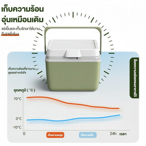 เก็บความเย็นได้นานประมาณ 12–24 ชั่วโมง (เมื่อใช้ร่วมกับถุงน้ำแข็ง)
