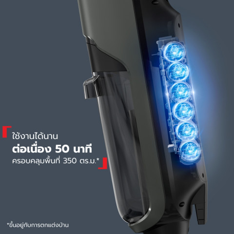 แบตอึด ครอบคลุมพื้นที่กว้าง ใช้งานต่อเนื่องสูงสุด 50 นาที รองรับการทำความสะอาดได้สูงสุดประมาณ 350 ตร.ม. ต่อการชาร์จ 1 ครั้ง