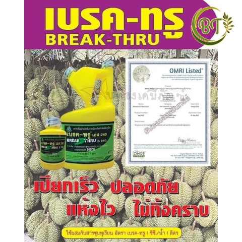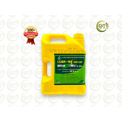 เบรค-ทรู เอส 240 (Break-Thru S 240) โปรครอป ขนาด 5 ลิตร (แกลลอน) สารเพิ่มประสิทธิภาพสำหรับงานพ่นปุ๋ยทางใบและสารป้องกันกำจัดศัตรูพืช ช่วยให้ละอองน้ำ แผ่กระจายเกาะใบได้แนบสนิท ลดการกลิ้งไหล เพิ่มการดูดซึมเข้าสู่ใบได้รวดเร็ว เหมาะทั้งการพ่นทั่วไปและการพ่นแบบใช้น้ำน้อย เพื่อผลลัพธ์ที่คุ้มค่าและสม่ำเสมอในแปลง
