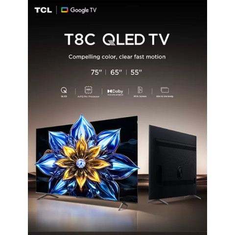 TV TCL รุ่น 65T8C ทีวีจอใหญ่ระดับพรีเมียมที่ยกระดับความบันเทิงในบ้านให้ “สวยทุกมุมมอง” ด้วย QLED 4K ดีไซน์ ไร้ขอบ พร้อมโทนหรู ป้าย QLED พรีเมี่ยมสีทอง ให้ภาพคมชัด สีสดสมจริง และมิติที่ลึกกว่าเดิม ครบเครื่องทั้งสายดูหนัง ฟังเพลง และเล่นเกมบน Google TV ที่ใช้งานง่าย ค้นหาคอนเทนต์ได้รวดเร็ว