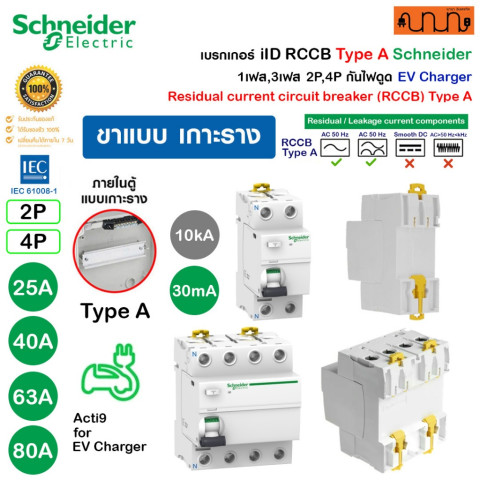 เบรกเกอร์กันไฟดูด Schneider Acti9 iID RCCB Type A สำหรับ EV Charger รุ่นแท้ 100% ออกแบบมาเพื่อปกป้องผู้ใช้งานจากอันตรายไฟดูด/ไฟรั่ว ด้วยความไวตรวจจับที่ 30mA (มาตรฐานความปลอดภัยที่นิยมใช้งาน) เหมาะอย่างยิ่งสำหรับวงจรเครื่องชาร์จรถยนต์ไฟฟ้าและโหลดอิเล็กทรอนิกส์ที่มีอินเวอร์เตอร์ ช่วยเพิ่มความมั่นใจทั้งบ้านพักอาศัยและงานอุตสาหกรรม