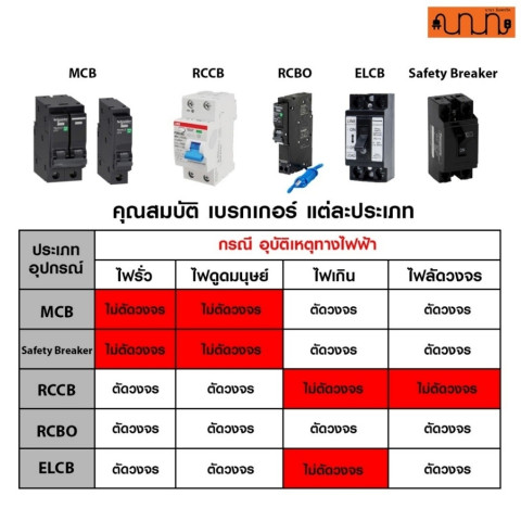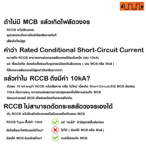RCCB ไม่ได้ป้องกันลัดวงจร/กระแสเกิน: ต้องติดตั้งร่วมกับ MCB หรือฟิวส์ ที่เหมาะสมเสมอ