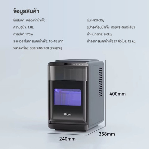 Hicon เครื่องทำน้ำแข็ง HZB-25y พร้อมระบบฆ่าเชื้อแสง UV 99.9% และนาโนแอนตี้แบคทีเรีย 99.9% เครื่องทำน้ำแข็งขนาดเล็กสำหรับใช้ในครัวเรือน เหมาะกับเครื่องดื่มเย็น ชงกาแฟ หรือใช้งานประจำวัน ผลิตน้ำแข็งได้รวดเร็ว ควบคุมได้ผ่านแอพ และมีระบบดูแลตัวเองด้วยโหมดทำความสะอาดอัตโนมัติ เพื่อความสะดวกและความมั่นใจทุกครั้งที่ใช้งาน