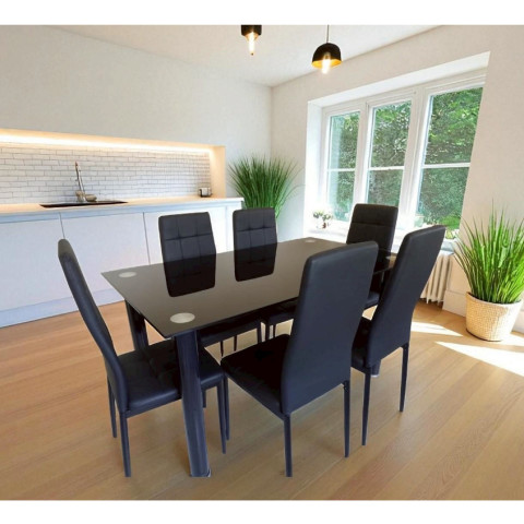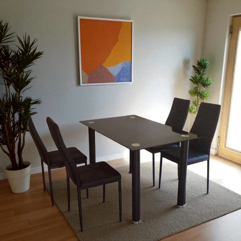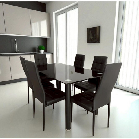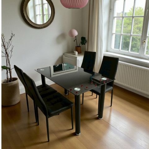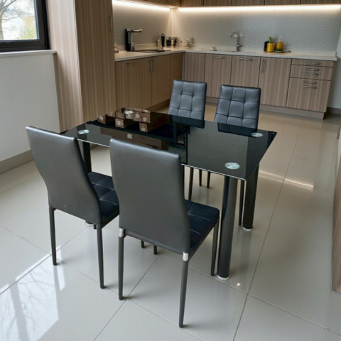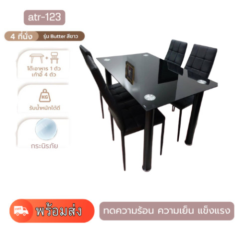 โต๊ะทานข้าวสีดำล้วน ดีไซน์โมเดิร์น เรียบหรูเข้าได้กับทุกสไตล์บ้าน มาพร้อมหน้าโต๊ะ กระจกนิรภัย TEMPERED GLASS หนา 8mm แข็งแรง ทนความร้อน และทนรอยขีดข่วนได้ดี เหมาะทั้งมื้อครอบครัวและการรับแขก เพิ่มความพรีเมียมให้มุมทานอาหารของคุณในทันที