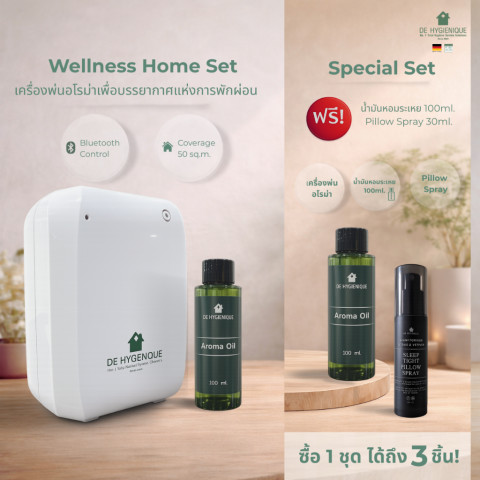 De Hygienique | Wellness Home Set เซ็ตดูแลบรรยากาศภายในบ้านด้วยเครื่องพ่นอโรม่ารุ่น Bluetooth ดีไซน์มินิมอล เข้าได้กับบ้านทุกสไตล์ ช่วยกระจายกลิ่นหอมได้อย่างทั่วถึงและสม่ำเสมอด้วยเทคโนโลยี Nano Scent Dispenser ให้บ้านรู้สึกผ่อนคลายแบบโรงแรมดังใจกลางเมือง พร้อมน้ำหอมปรับอากาศรีฟิล 100ml x2 และสเปรย์ฉีดหมอนสกัดจากธรรมชาติ เพื่อยกระดับการพักผ่อนทั้งกลางวันและก่อนนอน