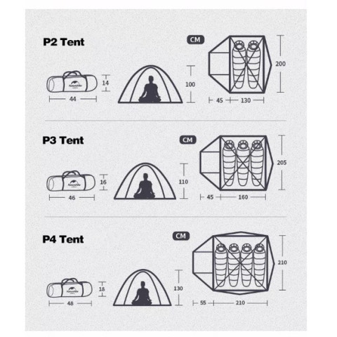 P3 (3 คน): 205 x (160+45) x 110 ซม. | น้ำหนักประมาณ 2.3 กก.