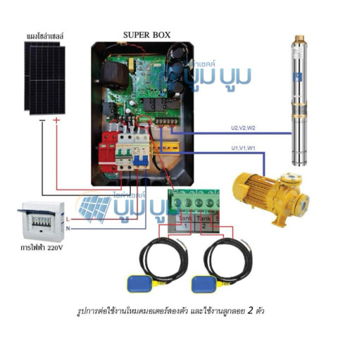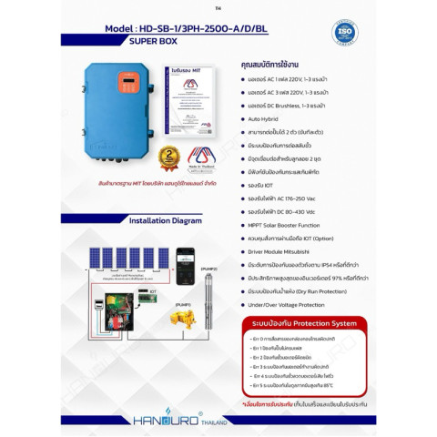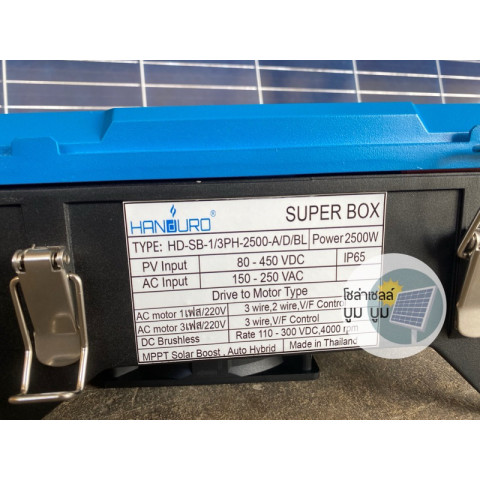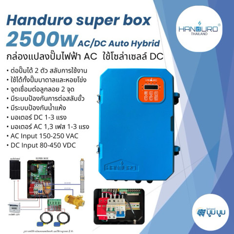 กล่องแปลงปั๊มไฟฟ้า AC ใช้โซล่าเซลล์ DC Handuro Super box 2500W AC/DC Auto Hybrid คือกล่องควบคุมโซล่าเซลล์ระบบ DC ที่ออกแบบมาเพื่อใช้งานร่วมกับปั๊มน้ำไฟฟ้าแบบ AC ได้อย่างลงตัว ช่วยให้คุณใช้งานพลังงานแสงอาทิตย์เพื่อสูบน้ำได้อย่างมีประสิทธิภาพ เหมาะสำหรับงานเกษตร ระบบน้ำบาดาล สวนไร่นา หรือพื้นที่ที่ต้องการลดค่าไฟและเพิ่มความต่อเนื่องในการทำงาน