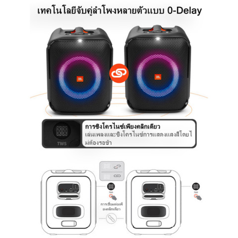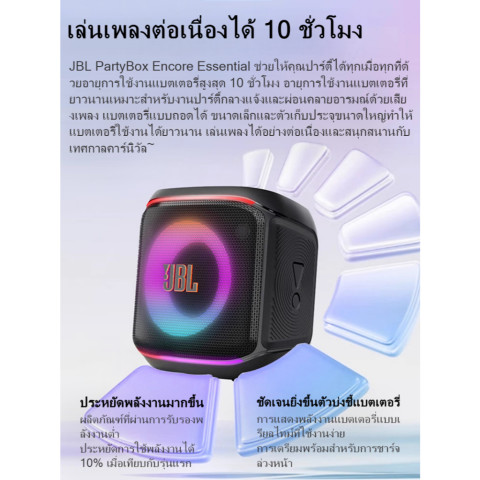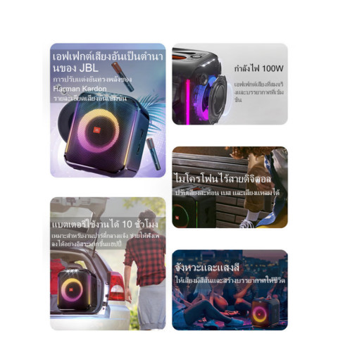 ฟีเจอร์เด่น: ไฟ RGB, ควบคุมผ่านแอป JBL Portable, ชาร์จอุปกรณ์ผ่าน USB, Auracast™ Multi-Link