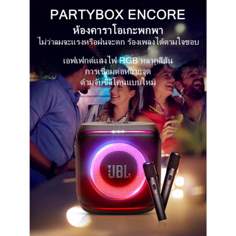 JBL Partybox Encore Portable Speaker w/ 2 Portable Wireless Bluetooth Microphones ลำโพงปาร์ตี้พกพาพลังเสียงแน่นสะใจ 100W พร้อมไมโครโฟนไร้สาย 2 ตัว ยกระดับทุกช่วงเวลาให้กลายเป็นเวทีคาราโอเกะสุดมันส์ ไม่ว่าจะปาร์ตี้ในบ้าน แคมปิ้ง หรืออีเวนต์กลางแจ้ง มาพร้อมไฟ RGB 360° เต้นตามจังหวะเพลง แบตอึดสูงสุด 10 ชั่วโมง และกันน้ำระดับ IPX4 พร้อมลุยทุกสถานการณ์