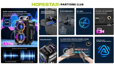 HOPESTAR PARTYONE CLUB ลำโพงบลูทูธสายปาร์ตี้พลังโหด 650W มาพร้อม ไมค์ไร้สายคู่ UHF ให้คุณร้องคาราโอเกะได้ทันที เสียงแน่นทุกย่าน เบสหนักสะใจ พร้อมระบบ AI SoundBoost 5.4 ที่ช่วยยกระดับความคมชัดของเสียงร้องและความลึกของเบสแบบเรียลไทม์ เหมาะทั้งงานเลี้ยง ร้านอาหาร คาเฟ่ งานนอกสถานที่ หรือไลฟ์สดขายของที่ต้องการเสียงเข้าคมชัด