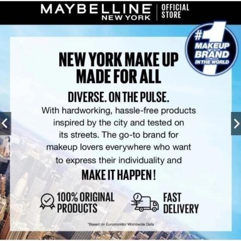 Maybelline New York คือแบรนด์เครื่องสำอางอันดับหนึ่งของโลก วางจำหน่ายกว่า 120 ประเทศ ด้วยการผสานนวัตกรรมล้ำสมัยเข้ากับความเชี่ยวชาญด้านเทรนด์จากมหานครนิวยอร์ก เพื่อสร้างสรรค์ความสวยที่เข้าถึงง่ายและใช้ได้จริงสำหรับทุกคน