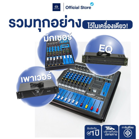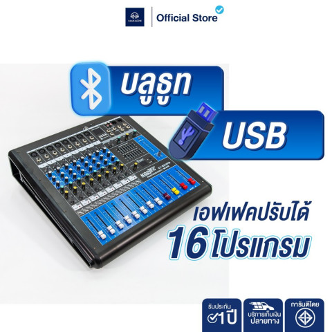 NAKACHI เพาเวอร์มิกซ์ KT-830PM เพาเวอร์มิกซ์รุ่นที่ 3 แบบครบจบในเครื่องเดียว ให้พลังขับ 2000W เสียงแน่น ชัดเจน เหมาะทั้งงานคาราโอเกะ งานอีเวนต์ ห้องซ้อม และงานติดตั้งภายในร้าน/สถานที่ต่าง ๆ ใช้งานง่ายด้วย 8 ช่องสัญญาณ รองรับการต่อไมค์และอุปกรณ์หลายแหล่งพร้อมกัน พร้อมฟังก์ชัน Bluetooth, USB และ EQ ให้ปรับแต่งโทนเสียงได้ตามสไตล์ที่ต้องการ