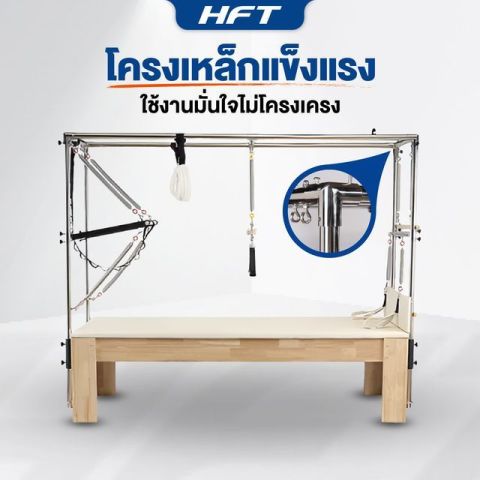 Pilates Cadillac (Trapeze Table) - Homefittools อุปกรณ์พิลาทิสระดับสตูดิโอสำหรับยกระดับการฝึกทั้ง ความยืดหยุ่น ความแข็งแรง การทรงตัว และการควบคุมแกนกลางลำตัว ในเครื่องเดียว ด้วยโครงสร้างแบบเตียงพร้อมเสา 4 มุม ติดตั้งสปริง สายรัด และบาร์หลากรูปแบบ ช่วยรองรับการฝึกได้ตั้งแต่พื้นฐานไปจนถึงท่าที่ท้าทาย เหมาะสำหรับโฮมยิม ครูสอนพิลาทิส และผู้ที่ต้องการอุปกรณ์ครบจบสำหรับการฝึกแบบเต็มระบบ