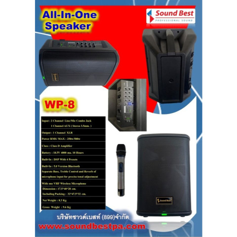 SOUNDBEST WP8 (WP-8) ลำโพงบลูทูธแบบพกพา “All In One” ที่ตอบโจทย์ทั้งงานพูด งานร้องคาราโอเกะ และงานอีเวนต์ขนาดเล็ก–กลาง มาพร้อมไมค์ลอยคลื่น UHF 1 ตัว จับถือแน่นด้วยด้ามอลูมิเนียม รับสัญญาณไกล ใช้งานคล่องตัว ไม่ต้องต่ออุปกรณ์หลายชิ้นให้ยุ่งยาก