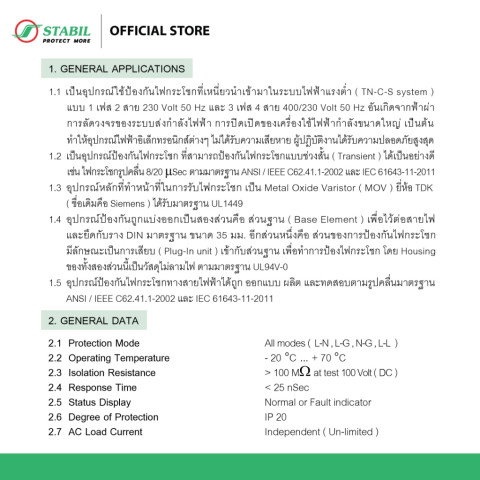 แกนหลักเป็น MOV คุณภาพสูง ใช้ Metal Oxide Varistor (MOV) ยี่ห้อ TDK (Siemens เดิม) ได้มาตรฐาน UL1449