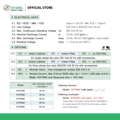 Residual Voltage (Ures): < 1.2 kV ที่ cat. B3/C1