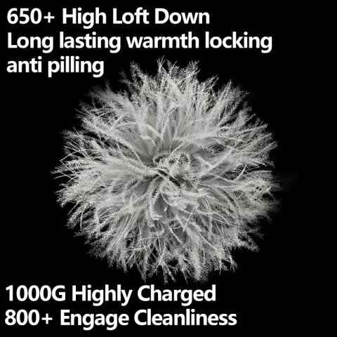 ไส้เป็ดดาวน์ 650FP (สัดส่วนดาวน์ 85%) ฟู อุ่น ล็อกอุณหภูมิได้ดี และไม่จับตัวเป็นก้อนง่าย