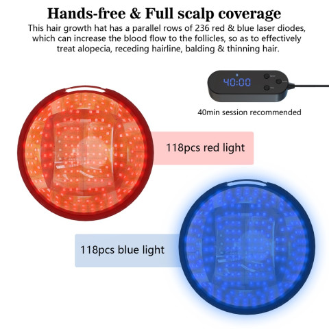 ด้วยไดโอดเลเซอร์รวมกว่า 238 ดวง (แสงสีแดง 118 ดวง และแสงสีฟ้า 118 ดวง) กระจายทั่วทั้งหมวก เพื่อให้การครอบคลุมเต็มศีรษะและสม่ำเสมอ ช่วยกระตุ้นรากผมได้ลึกถึงระดับรูขุมขน เพิ่มการไหลเวียนโลหิตบนหนังศีรษะ ส่งเสริมการสร้างเส้นผมใหม่ให้แข็งแรง หนาแน่น และดูสุขภาพดีขึ้นอย่างเป็นธรรมชาติ